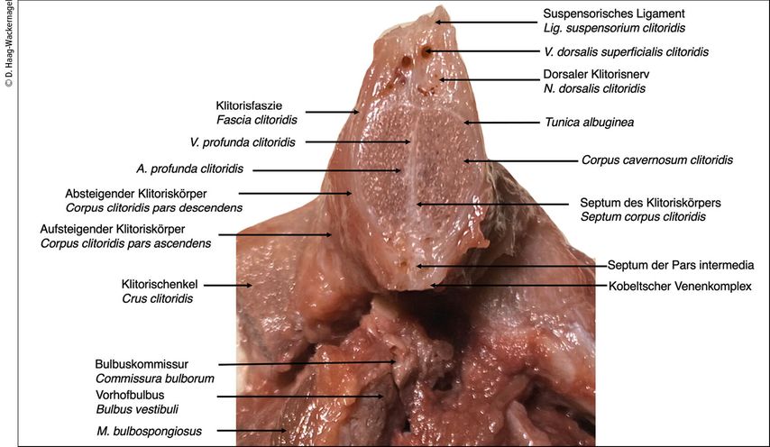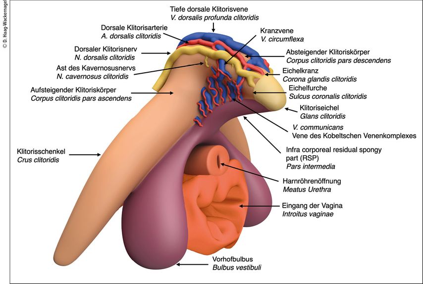 1 De Graaf R: De mulierum organis in generationi inservientibus tractatus novus. Ex officinas Hackiana16722 Kobelt GL: Die männlichen und weiblichen Wollustorgane des Menschen und einiger Säugethiere in anatomisch-physiologischer Beziehung. Freiburg im Breisgau, Druck und Verlag von Adolph Emmerling 1844 3 Haag-Wackernagel D: Sensorische Nervenendigungen – der Schlüssel zur weiblichen Lust. Sexuologie 2022; 29(1): 5-20 4 Haag-Wackernagel D: Die Klitoris – das zentrale Organ der weiblichenLust. Teil 1: Entdeckt, ignoriert und verleugnet – die erstaunliche Geschichte des Bulbo-Klitoralorgans. Frauenarzt 2021; 6: 402-7 5 Dickinson R L: Human Sex Anatomy. Bailiere, Tandall & Cox London, 1933 6 Di Marino V, Lepidi H: Anatomic Study of the Clitoris and the Bulbo-Clitoral Organ. 152 S. Springer International Publishing Switzerland, 2014 7 Schünke M et al.: PROMETHEUS LernAtlas der Anatomie: Allgemeine Anatomie und Bewegungssystem. Thieme Verlag, 2022 8 Longhurst GJ et al.: Beyond the tip of the iceberg: A meta-analysis of the anatomy of the clitoris. Clin Anat 2024; 37(2): 233-252 9 Wallen K, Lloyd E: Clitoral variability compared with penile variability supports non-adaptation of female orgasm. Evol Dev 2008; 10(1): 1-2 10 Shih C et al.: The pars intermedia: an anatomic basis for a coordinated vascular response to female genital arousal. J Sex Med 2013; 10(6): 526-30 11 Kruepunga N et al.: The development of the cloaca in the human embryo. J Anat 2018; 233(6): 724-39 12 Zdilla MJ: Anatomy of the clitoris: the corona of the glans clitoris, clitoral coronal papillae, and the coronopreputial frenulum. Anat Cell Biol 2024; 57(2): 183-93 13 Aerts L et al.: Retrospective study of the prevalence and risk factors of clitoral adhesions: women’s health providers should routinely examine the glans clitoris. Sex Med 2018; 6(2): 115-22 14 Romanello J et al.: Clitoral adhesions: a review of the literature. Sex Med Rev 2023; 11(3): 196-201 15 Uloko et al.: How many nerve fibers innervate the human glans clitoris: a histomorphometric evaluation of the dorsal nerve of the clitoris. J Sex Med 2023;20(3):247-252 16 Furnas HJ et al.: The safe practice of female genital plastic surgery. Plastic and reconstructive surgery. Plast Reconstr Surg Glob Open 2021; 9(7): e3660 17 Qi L et al.: Krause corpuscles are genital vibrotactile sensors for sexual behaviours. Nature 2024; 630(8018): 926-3418 Abraira VE, Ginty DD: The sensory neurons of touch. Neuron 2013; 79(4): 618-39 19 Ohmori D: Über die Entwicklung der Innervation der Genitalapparate als peripheren Aufnahmeapparat der genitalen Reflexe. Z f Anatomie und Entwicklungsgeschichte 1924; 70: 347-410 20 Amsterdam A, Krychman M: Clitoral atrophy: A case series. J Sex Med 2009; 6(2): 584-7 21 Battaglia C et al.: Menstrual cycle-related morphometric and vascular modifications of the clitoris. J Sex Med 2008; 5(12): 2853-61 22 Lundberg PO: Die periphere Innervation der weiblichen Genitalorgane. Sexuologie 2002; 9(3): 213-25 23 Simek IM et al.: Incidence of and risk factors for clitoral lacerations in a retrospective cohort of more than 14.000 vaginal singleton deliveries. Eur J Obstet Gynecol Reprod Biol 2018; 224: 45-6 24 Doğan B: Long-term impacts of vaginal birth with mediolateral episiotomy on sexual and pelvic dysfunction and perineal pain. Matern Fetal Neonatal Med 2017; 30(4): 457-60