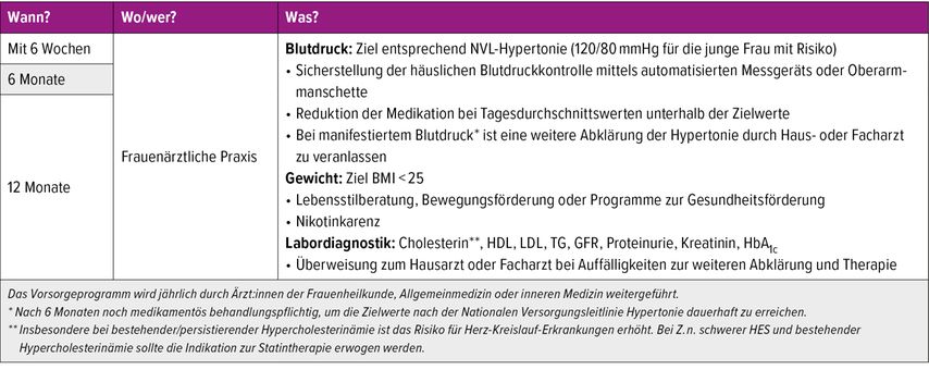 Frauen mit einer hypertensiven Erkrankung in der Schwangerschaft gehören zu der Hochrisikogruppe für spätere kardiovaskuläre Erkrankungen. Der in den 1970er-Jahren in England geprägte Begriff des „vierten Trimesters“ unterstreicht die besondere frauenärztliche Zuständigkeit in den ersten Monaten nach der Geburt. Im Falle persistierender Befundkonstellationen wie anhaltenden Bluthochdrucks und/oder bestimmter erhöhter Laborparameter, sollte die weitere Betreuung an Fach- oder Hausärzt:innen übergehen. Die Aufklärung der Wöchnerinnen hierzu ist essenziell und umfasst Rezidivrisiko, kardiovaskuläre Langzeitfolgen und ein Nachsorgekonzept: Blutdruckselbstmessung sowie Nieren-, Cholesterin- und Leberwertekontrollen sowie eine Beratung zu Gewichtsmanagement und Lebensstil. Ärztliche Kontrolluntersuchungen sollten nach sechs Wochen, nach sechs und zwölf Monaten sowie anschließend einmal jährlich erfolgen. Tabelle 1 gibt einen Überblick.