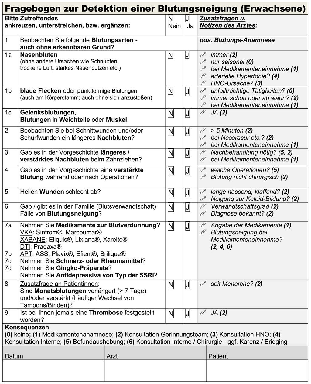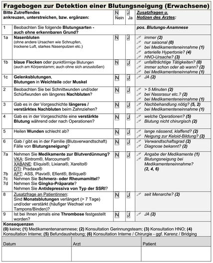 Aus diesem Grund wird eine standardisierte Gerinnungsanamnese empfohlen und auf deren Basis bzw. auf Basis des geplanten Eingriffs entsprechende laborchemische Gerinnungsuntersuchungen.