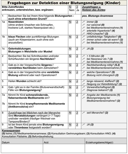 Dokumentierte standardisierte Gerinnungsanamnese (kinderadaptierte Variante; Familienanamnese), inkl. Medikamentenanamnese und klinischer Untersuchung.