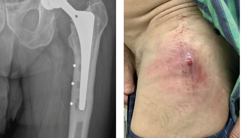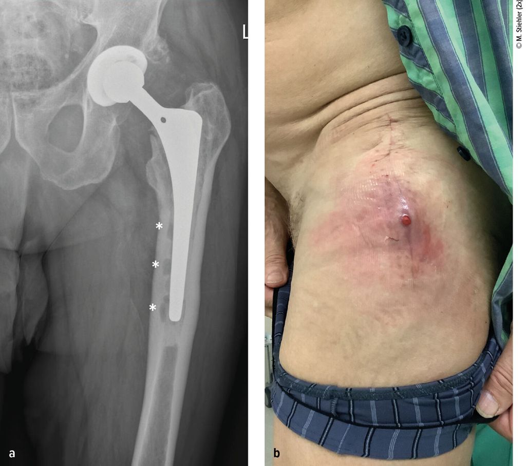 Anhand der klinischen Zeichen und der Symptomdauer unterscheidet man zwischen akuter und chronischer PPI. Die akute PPI ist durch eine kurze Symptomdauer (<3 Wochen) charakterisiert. Sie tritt entweder in der frühen (<4 Wochen) Phase nach endoprothetischem Gelenkersatz (akute postoperative PPI) oder aber verzögert (>4 Wochen, ggf. erst mehrere Jahre) nach Endoprothesenimplantation im Rahmen einer hämatogenen Streuung eines endoprothesenfernen Infektionsherdes (akute hämatogene PPI) auf. Typischerweise imponieren hier lokale Infektionszeichen wie Schmerzen, Schwellung, Rötung, Überwärmung oder eine prolongierte Wundsekretion (>7 Tage). Die Unterscheidung zwischen akuter und chronischer PPI basiert auf den Eigenschaften des bakteriellen Biofilms. Beim Vorliegen einer akuten PPI ist von einem unreifen bakteriellen Biofilm auf der Endoprothesenoberfläche auszugehen. Bei der chronischen PPI (>4 Wochen postoperativ) mit längerer Symptomdauer (>3 Wochen) liegt hingegen ein potenziell reifer Biofilm vor. Die klinischen Symptome sind in der Regel weniger ausgeprägt. Jedoch kann das Vorliegen einer kutanen Fistel oder von radiologischen Zeichen der Endoprothesenlockerung auf eine chronische Infektion hinweisen (z. B. Abb. 1).