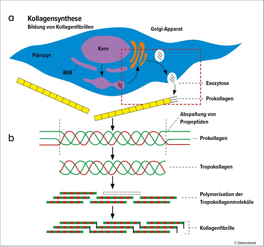 Kollagenbündel finden sich dicht gepackt in der unteren Schicht der Dermis und sind maßgeblich für den Zustand und das Erscheinungsbild der Haut verantwortlich. Sie ermöglichen die Elastizität und Widerstandsfähigkeit und sorgen für die Spannkraft der Haut. Dies tun sie mithilfe von Elastin und Hyaluronsäure, die als Glylosaminoglykan enorm viel Wasser binden kann und so für die notwendige Hydratation der Haut unentbehrlich ist. Die körpereigene Kollagenproduktion nimmt ab dem 25. Lebensjahr stetig ab, der Abbau durch Matrix-Metalloproteasen beginnt zu überwiegen und zusätzlich verdünnt sich das vorhandene Kollagennetz mit zunehmendem Alter. Dies führt zum Verlust von Spannkraft und Elastizität der Haut und macht sich auch in beginnender Faltenbildung bemerkbar. Dieser Prozess wird durch UV-Einstrahlung (Sonnenbäder) noch beschleunigt. Auch das Vorhandensein von Hyaluronsäure in der Dermis und Epidermis verringert sich mit fortschreitendem Alter, wodurch Falten stärker sichtbar werden.