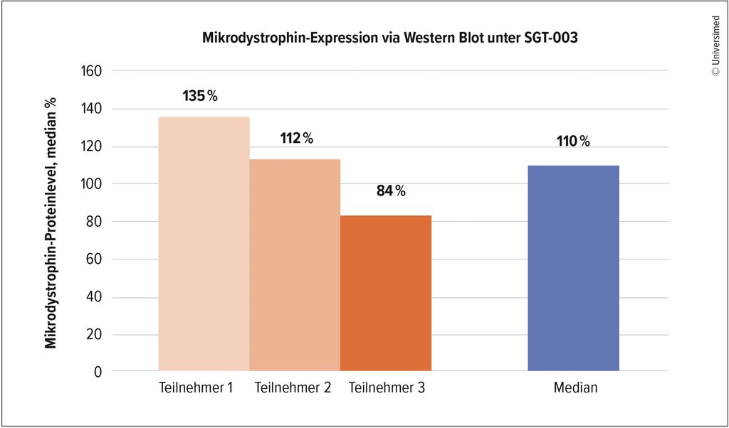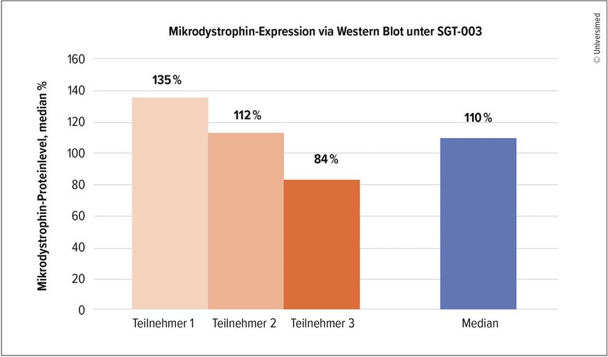 Abb. 2: Die ersten Biopsiedaten pädiatrischer Patient:innen in der Studie INSPIRE DUCHENNE zeigten eine Wiederherstellung der Mikrodystrophinexpression via Western Blot unter der Gentherapie SGT-003