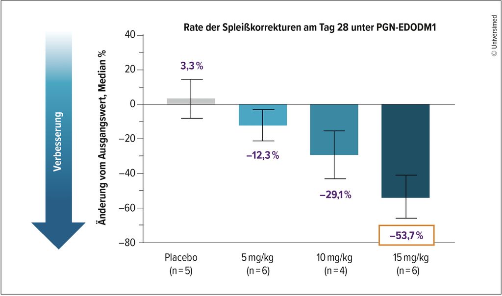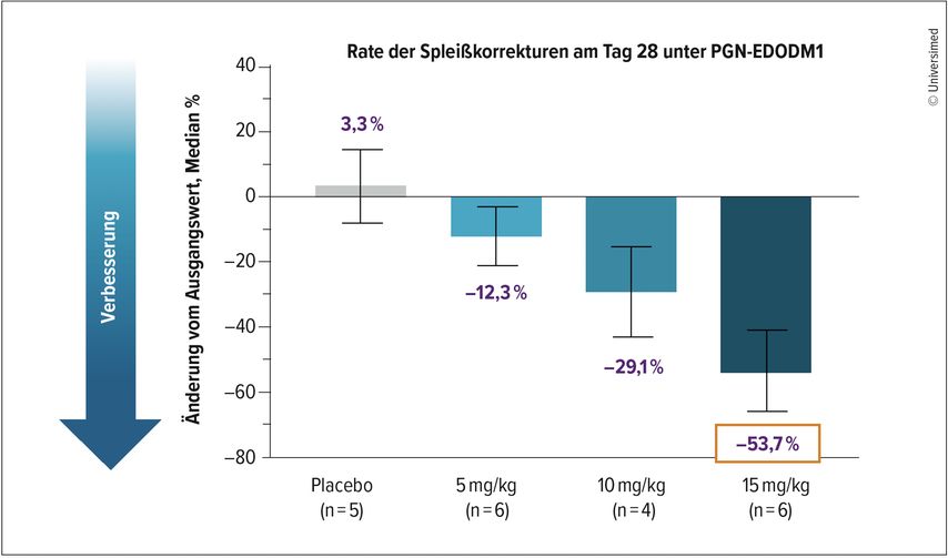Abb. 3: Die Phase-I-Studie FREEDOM-DM1 zeigte bereits vielversprechende Ergebnisse in der Korrektur des fehlerhaften Spleißens bei Patient:innen mit myotoner Dystrophie Typ 1 am Tag 28 unter PGN-EDODM1